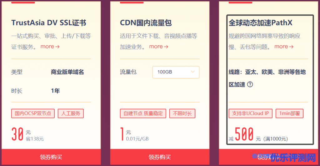 在UCloud全球云产品,全场1折起促销活动页面领PathX代金券,不限新老用户,限领一次。