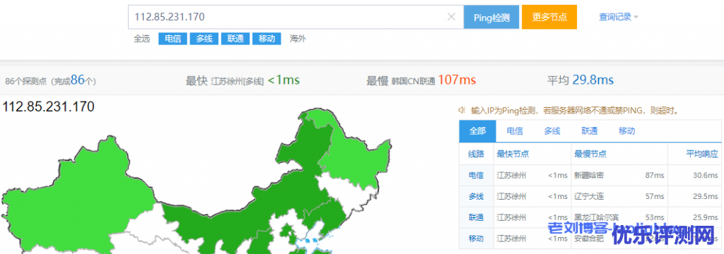 使用站长工具Ping测试了国内三网网络延时性,最快不到1ms,最慢107ms,均值29.8ms,网络延时低,性能不错。