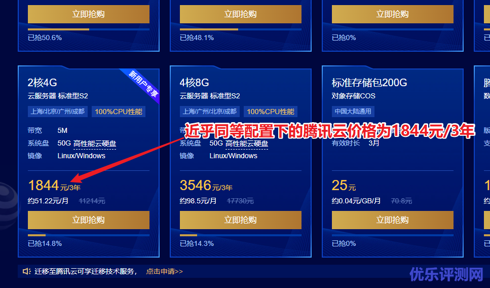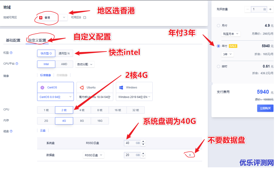 这里以购买2核4G内存促销方案为例。首选选择区域和配置,具体看图: