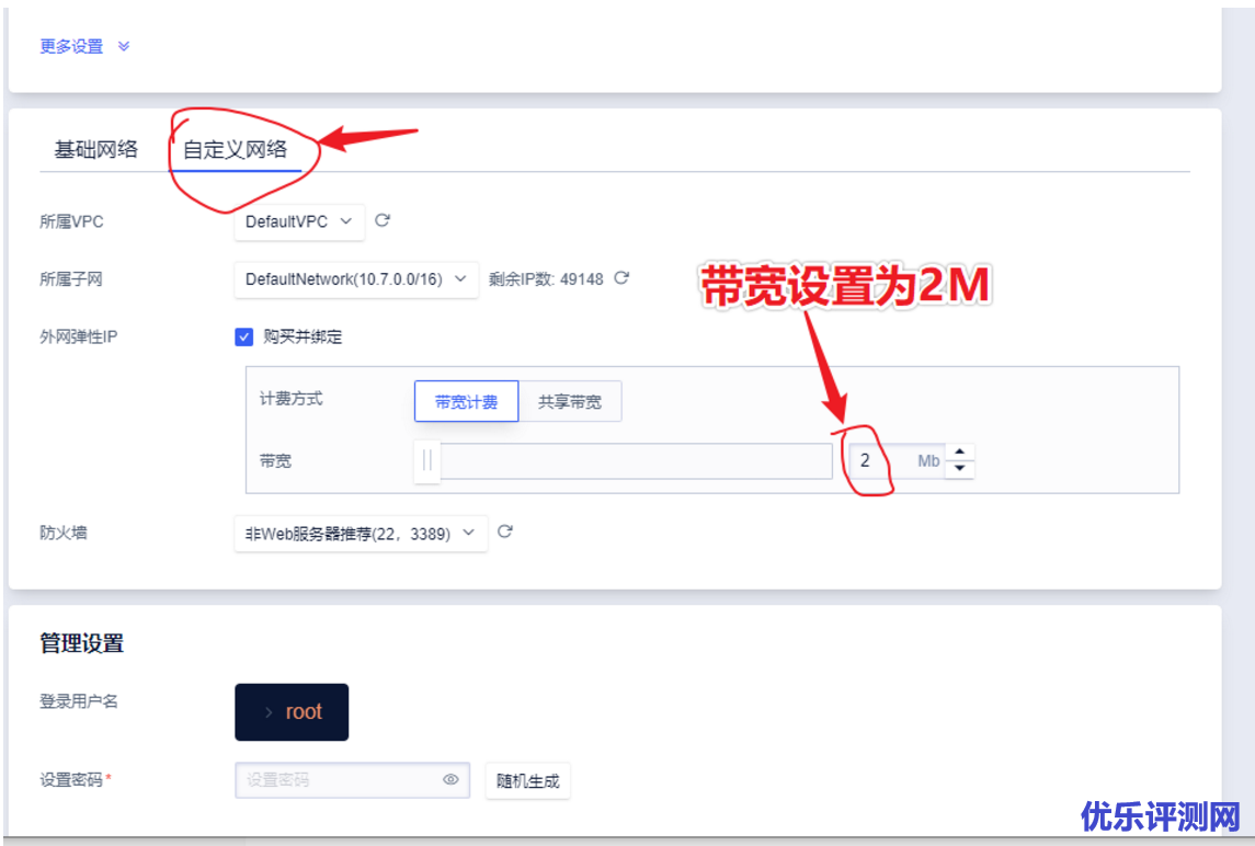 下面选择网络,因为领取的2M的带宽,所以你必须选择2M的带宽。点击自定义网络,如图: