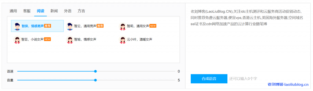 使用TTS产品页上的试用demo感受了下,老刘把老刘博客站点介绍复制了上去,让机器人合成语音,播放出来的语音高拟真度,而抖音上经常加的那种机器人声音太尴尬,和这个没法比。前往体验腾讯云语音合成TTS试用产品>>