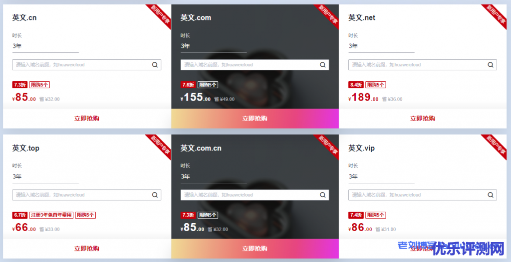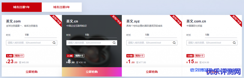 华为云服务商金秋时节推出了华为云域名金秋上云狂欢活动,.com首购23元|.cn首购8.9元|全场域名1元起购。活动区分四个专区,分别为新用户福利1元购、全民普惠低至3折,批量注册专享500元代金券和企业上云特惠推荐。老刘博客这里主要就新用户福利作下介绍,更多专区活动内容可以通过下面活动入口了解。