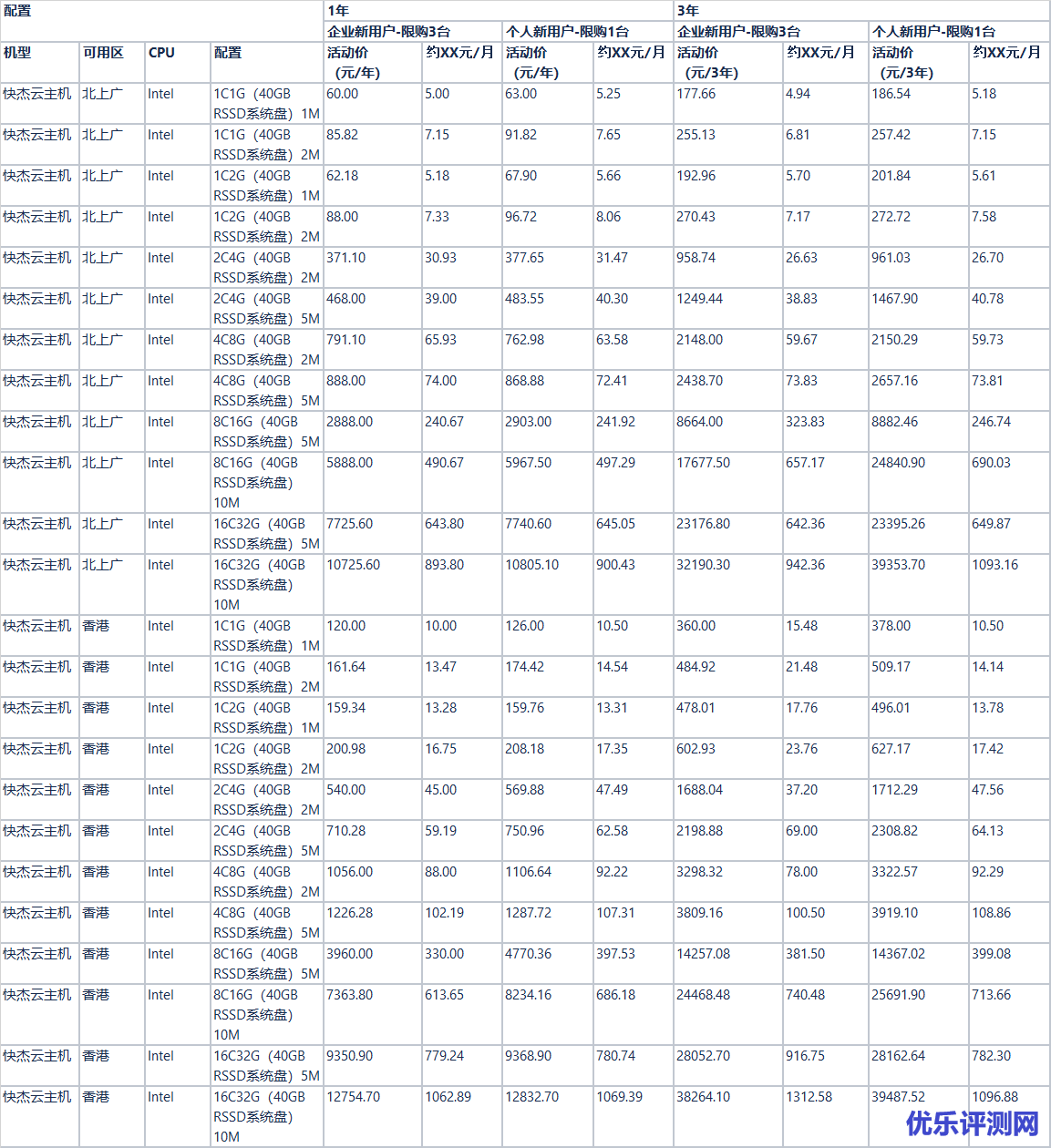 有些同学说界面看不到1年或3年以及地域不同情况下云服务器具体价格,这里老刘博客从内部朋友那里获得了一张UCloud双11活动云服务器价格表,贴出如下: