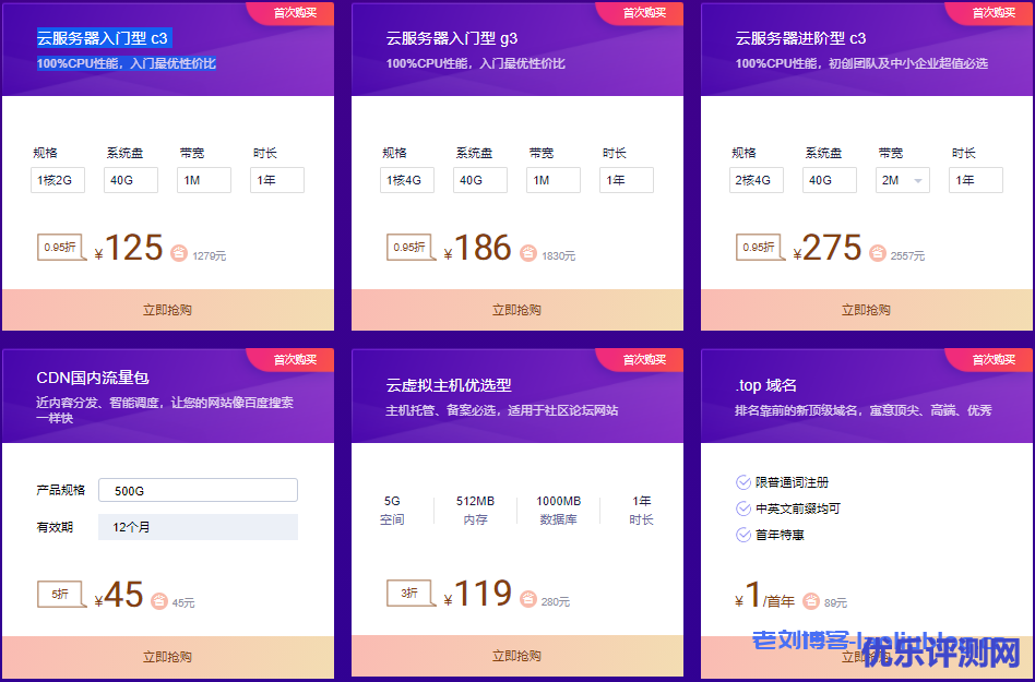 首次购买以下产品的用户可参与,企业与个人用户同享,不限注册时间,每类产品限购1次。如云服务器入门型 c3,100%CPU性能,入门最优性价比,配置1核2G,1M带宽,系统盘40G,年付只要125元(0.95折),更多特惠见下图: