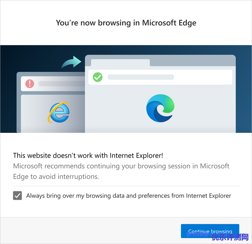 如上面的屏幕截图所示,重定向至 Microsoft Edge 时,浏览器会为用户显示一次性对话框。此对话框说明重定向的原因,并提示是否同意将浏览数据和设置从 Internet Explorer 导入到 Microsoft Edge,具体包括:收藏夹、密码、搜索引擎、打开的选项卡、历史记录、设置、Cookie 和主页。导入数据不是必选项,不勾选也可以继续下一步。