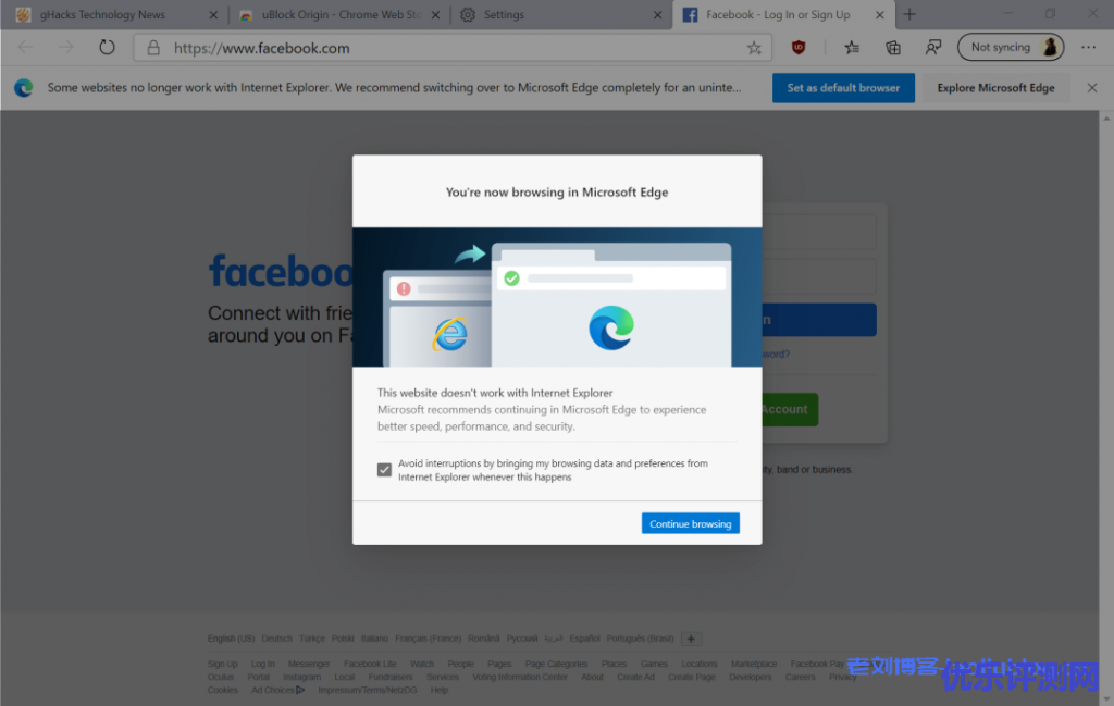 微软也意识到了此问题,它表示许多现代网站的设计都与 Internet Explorer 不兼容。当 Internet Explorer 用户访问不兼容的站点时,他们会收到一条消息,提醒此站点与浏览器不兼容,并且需要手动切换到其他浏览器。此操作略为繁琐,因此从 Edge 87 开始,微软将自动为用户切换至 Edge。