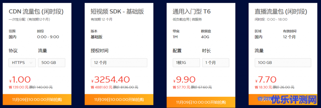 11月9日10:00准时开始抢购,参与秒杀的产品包括CDN、短视频SDK、通用型入门型T6和直播流量包,相关参数及价格如下: