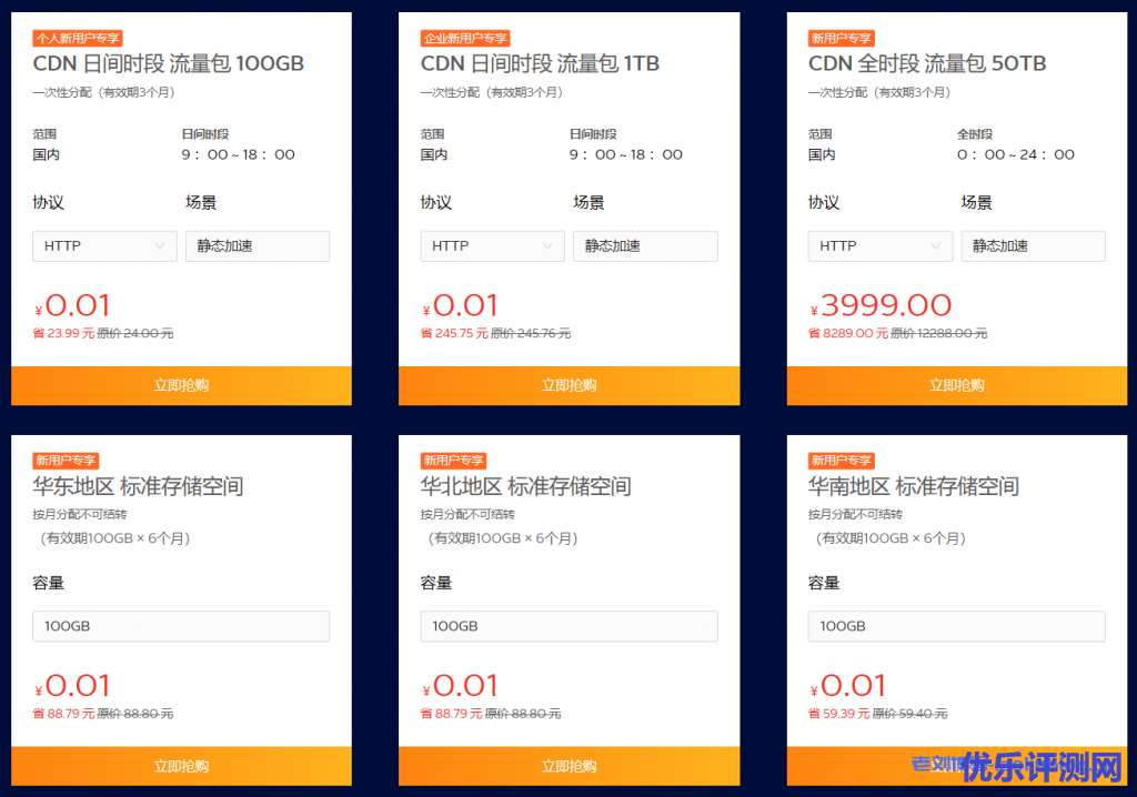 RTC实时音视频,专享包时长:2万分钟,6个月免费;10TB国内直播流量包(全时段),1年1777元;活体人脸核验,免费使用100次,有效期1年;同时我们主要来看看他家的主打产品CDN和云存储促销力度,价格如下图: