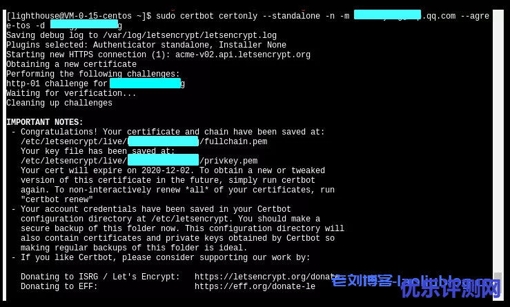 # 安装Let'sEncrypt的certbot工具 # sudo yum install certbot # 停止Nginx服务 # sudo killall nginx # 申请证书 # sudo certbot certonly --standalone -n -m your-email@example.com --agree-tos -d YourAwesome.Domain