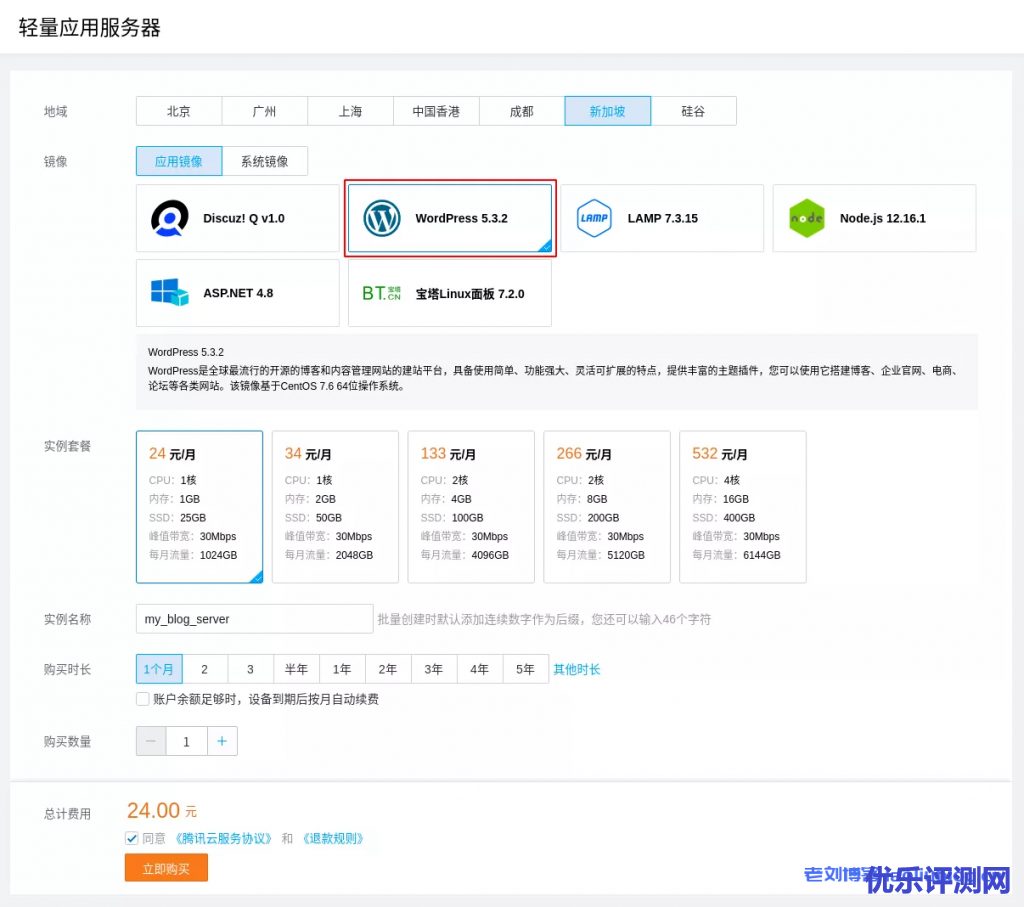 本教程选用新加坡地域的 WordPress 镜像1核1G套餐。看得出来,整个购买过程相当简洁,仅需要选择应用镜像和实例套餐即可,体验流畅。