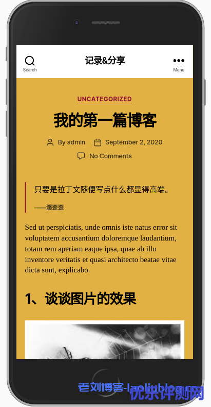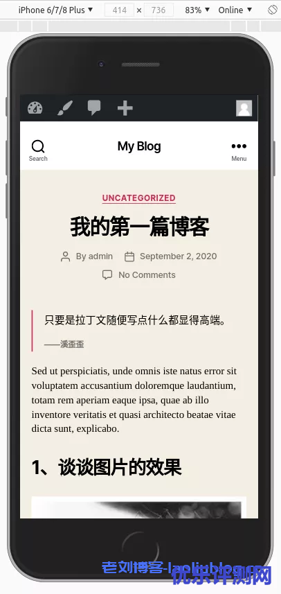 WordPress生成的页面是终端自适应的,可以通过浏览器的调试功能(Developer tools -> Toggle device toolbar)来调整验证其在手机屏幕上的展示效果。