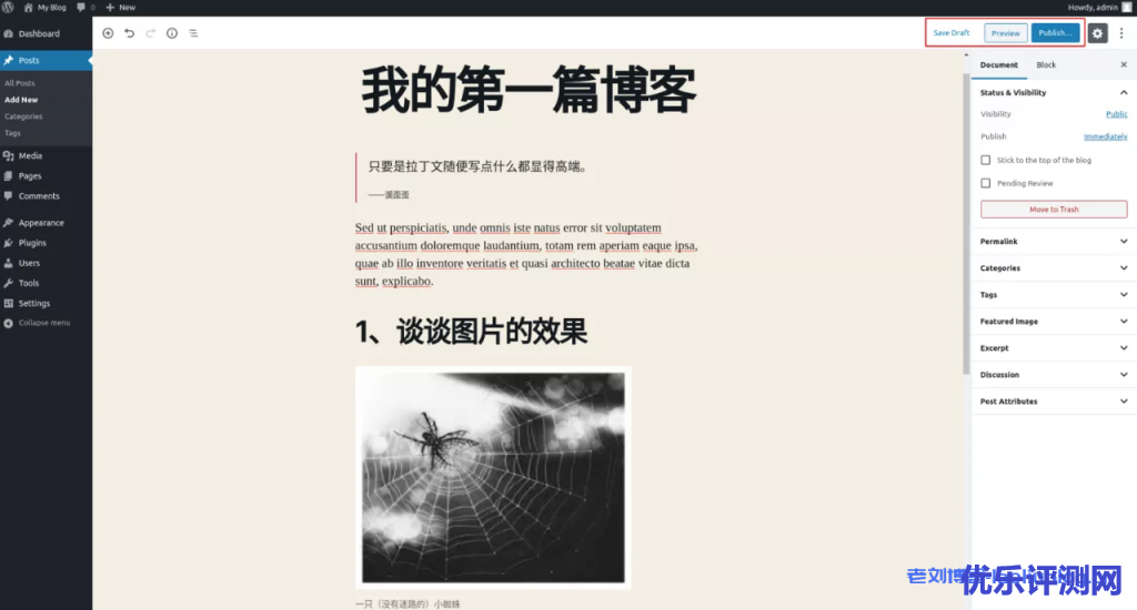 在文章编辑界面,我们可以所看即所得地编辑博客内容。主编辑区域可以完成添加标题、段落、引用、插入图片/视频等等内容编辑工作;而右侧边栏里是用来完成对文章元数据/属性的设置,如所属的分类、标签等。注意Permalink这个属性指的是该文章的永久URL链接,可以理解为它是外部访问此文章时用的“指定ID”,搜索引擎也是通过Permalink来检索文章的。