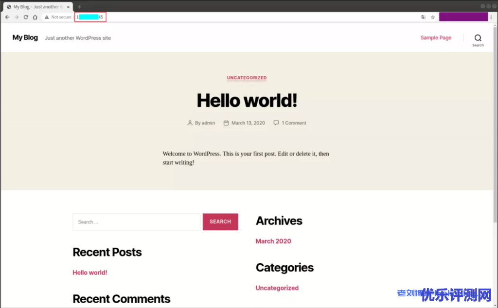 点击“管理”即可进入实例管理界面。在“应用管理”下方点击“首页地址”(更简单点,直接在浏览器输入服务器公网IP),我们将看到 WordPress 的站点主页 Hello world! 示例博客。服务器创建顺利完成,It works!