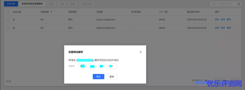 点击DNS解析,在CNS(腾讯云解析服务)界面,选择快速“添加网站解析”,会将www和@的A记录绑定到我们的服务器IP即可。后续我们的博客就能通过域名访问了。