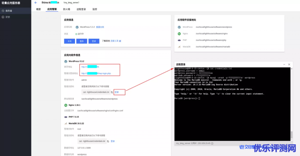 在Lighthouse的实例控制台页面,其下的“应用管理”标签栏中,详细展示如何登录WordPress控制面板的方法。