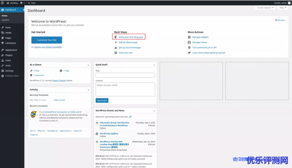 添加文章可以通过左侧Posts管理子界面里Add New按钮直接完成创建;也可以更简单地,如下图直接通过链接“write your first blog post”进入文章编辑界面。