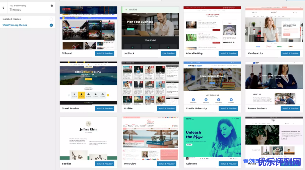 下图为WordPress.org的主题库,点击“Install & Preview”按钮即可安装(下载需要一些时间)并与即时预览了。