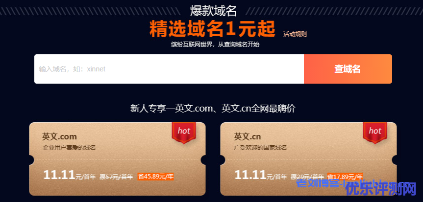新人专享英文.com后缀、英文.cn全网最嗨价首年11.11元。