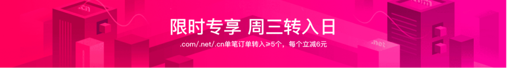 阿里云周三转入优惠日,每周三全天24小时内.com英文域名,.cn英文域名,.net英文域名转入只需23元/年起。周三转入日活动入口>>