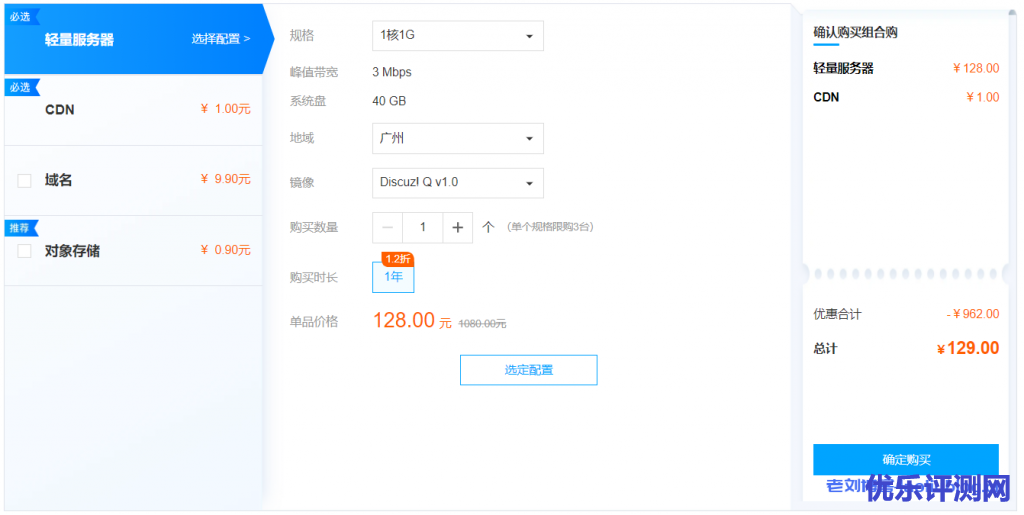从2020年10月15日起,腾讯云推出基础产品组合特惠活动(长期有效),针对建站、电商、游戏、音视频等场景,一站式组合购买可享更多优惠。各业务场景中,云服务器单个配置限购3台,域名、短信、云数据库(MySQL、Redis)限购10台,CDN、COS、CI资源包限购20个。