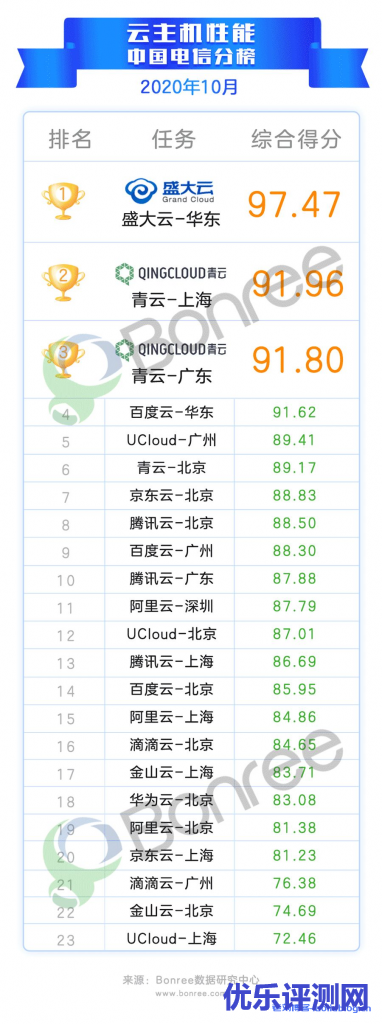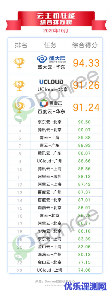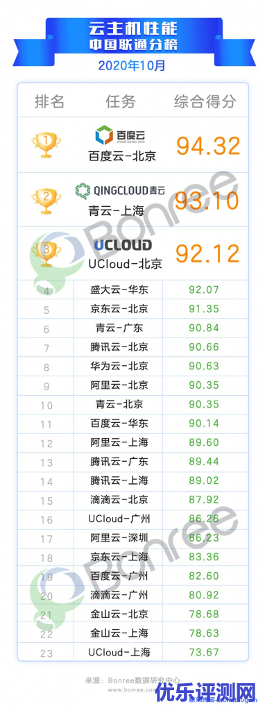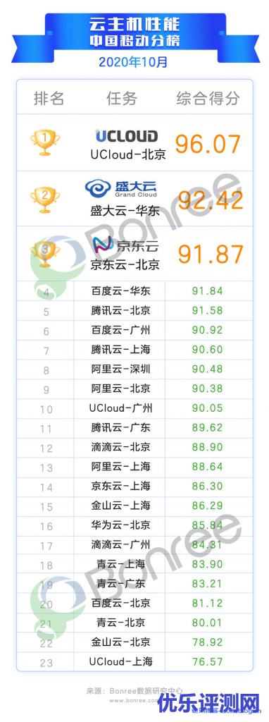在2020年10月云主机性能综合排行榜中,盛大云-华东位居榜首,UCloud-北京和百度云-华东分列第二、三名。