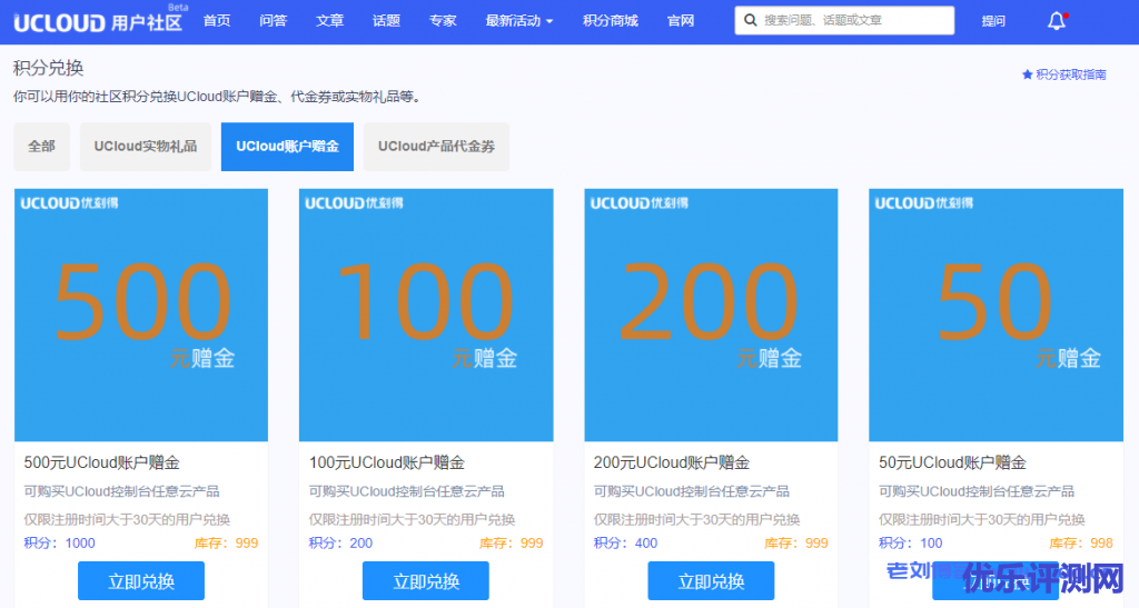 积分商城:这是老刘最喜欢的模块了,通过提问、回答问题。发布文章、评论内容、邀请好友和签到等方式获取的社区积分达到一定数值可以兑换相应的UCloud周边礼品、UClod账号赠金和UCloud产品代金券。前往社区>>