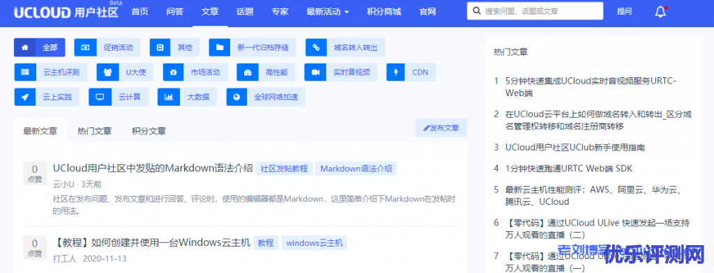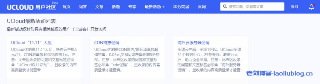 老刘博客在前文《UCloud用户社区即将发布,写问答发文章均可换赠金》中,有提前预告了UCloud优刻得推出的UCloud用户社区的动向,今天老刘看到UCloud已经在起官网不同位置投放了UCloud用户社区入口,那么此次上线的UCloud用户社区Beta版都有哪些值得关注的地方呢?总结一句话:可以在社区中赚积分兑换UCloud产品代金券。前往社区>>