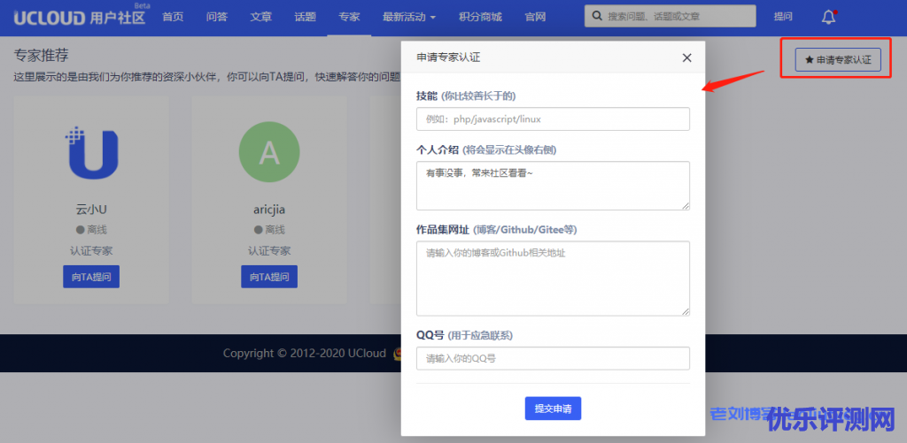 专家模块:专家模块主要是UCloud官网客服人员以及其他社区成员,长期活跃用户,生产优质内容会员,可以申请专家认证,以最显眼的方式收获他人关注,向你发私信和提问的频次更多了(这意味着更多的积分和更多的UCloud产品代金券)。前往社区>>