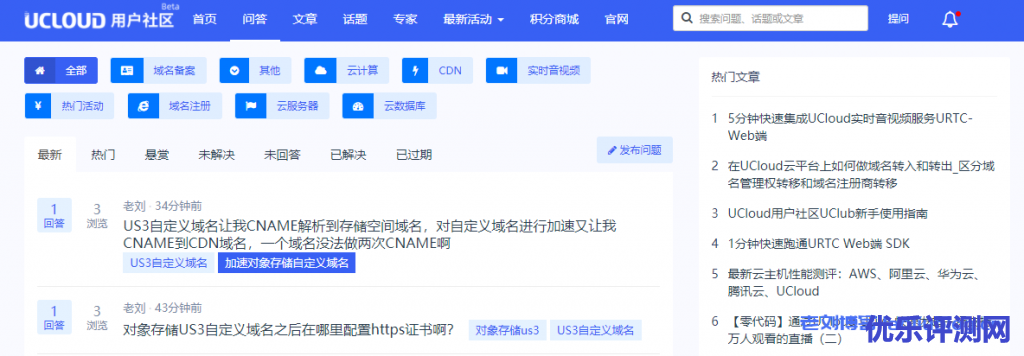问答模块:用户可以在此发布提问,交流工作学习中困扰自己的问题,或者针对不紧急的问题,在此发起提问,等待UCloud官方答复或者其他社区成员答复。前往社区>>