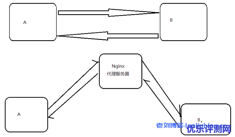 - 反向代理服务器:现在我们A需要访问的目标B服务器的10.7.182.100,我要访问这个B服务器上的资源,现在如果使用了Nginx之后,我可以通过Nginx服务器从而达到访问10.7.182.100这个服务器的目的