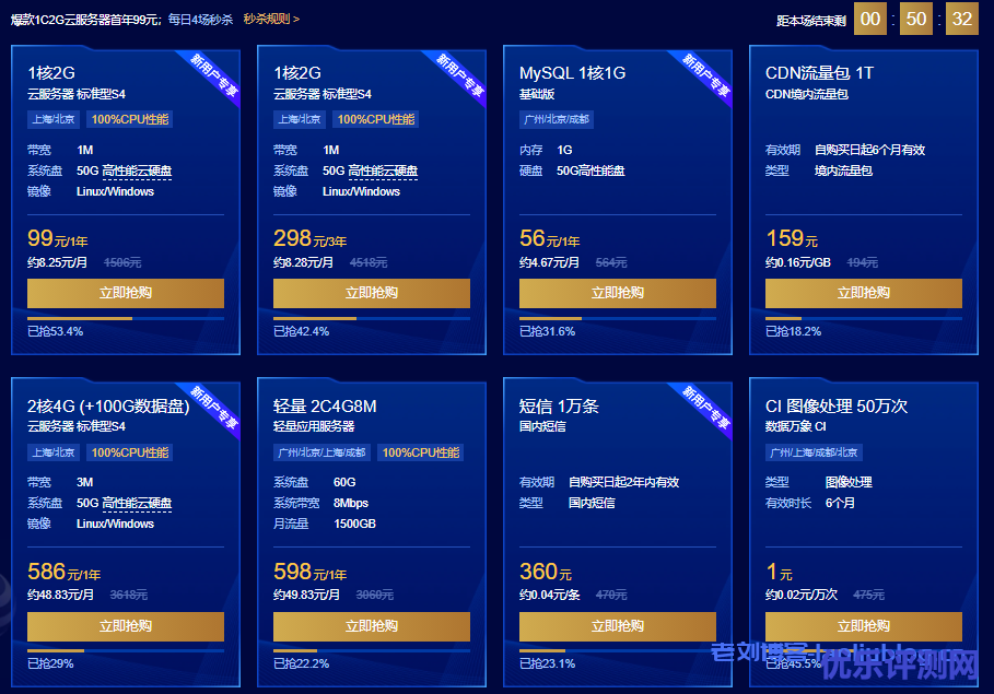 限时秒杀每天4场,分别在每天8点、13点、16点和19点。除了爆款入门级云服务器1核2G内存配置年付99元,3年付298元外,也可描述高配置云服务器,如2核4G5M,4核8G5M等,当然性价比好的都是腾讯云新用户专享优惠的机器。