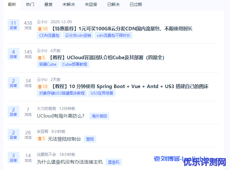 注册UCloud用户社区(优刻得社区)账号后即可开始提问,除了UCloud云服务器使用问题外,也可以提问其他任何关于云计算的问题。目前社区刚起步,人气不高,但是为了吸引用户,UCloud官方有专人负责维护社区,所以基本所有问题都会得到解答: