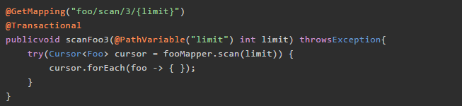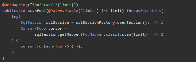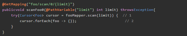 方法 scan() 是一个非常简单的查询。通过指定 Mapper 方法的返回值为 Cursor 类型,MyBatis 就知道这个查询方法一个流式查询。然后我们再写一个 SpringMVC Controller 方法来调用 Mapper(无关的代码已经省略):