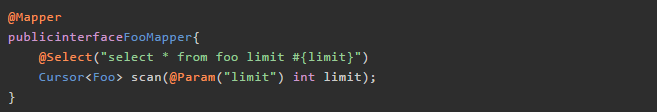 上面的代码中,fooMapper 是 @Autowired 进来的。注释 1 处调用 scan 方法,得到 Cursor 对象并保证它能最后关闭;2 处则是从 cursor 中取数据。上面的代码看上去没什么问题,但是执行 scanFoo0() 时会报错: