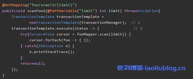 上面的代码中,1 处我们创建了一个 TransactionTemplate 对象(此处 transactionManager 是怎么来的不用多解释,本文假设读者对 Spring 数据库事务的使用比较熟悉了)。2 处执行数据库事务,而数据库事务的内容则是调用 Mapper 对象的流式查询。注意这里的 Mapper 对象无需通过 SqlSession 创建。