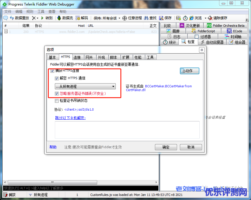 Fiddler-工具-选项-HTTPS,勾选以下三个选项: