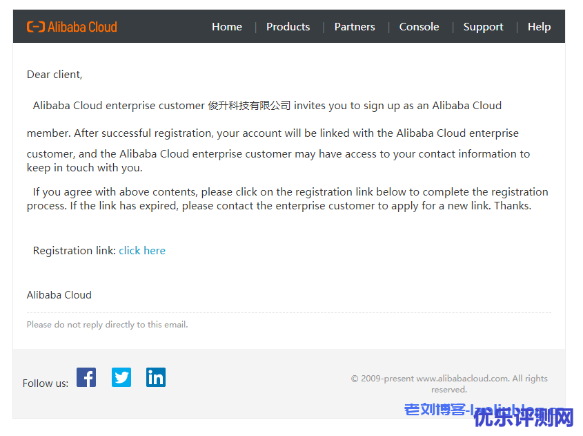联系阿里云国际站渠道分销商天鹅云:www.swancloud.com(已经工单确认过是正规授权的分销商)给你发账号注册邀请邮件:
