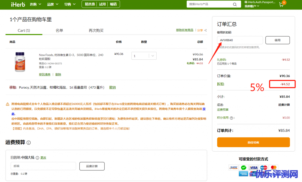 在iHerb官网(可以选择中国地区)选择合适的商品后放入购物车后,直接使用这个iHerb永久折扣码即可获得5%的折扣。这个折扣码AVW8840也是iHerb礼券码、iHerb优惠码,永久有效,在iHerb购物的每一单均可使用这个iHerb永久折扣码获得5%的优惠。之前iHerb有新人首单优惠10%,但是现在iHerb首单优惠已经取消了,只能使用上述iHerb折扣码获得每单5%的折扣优惠,可以与购物车立减活动叠加使用获得折上折。