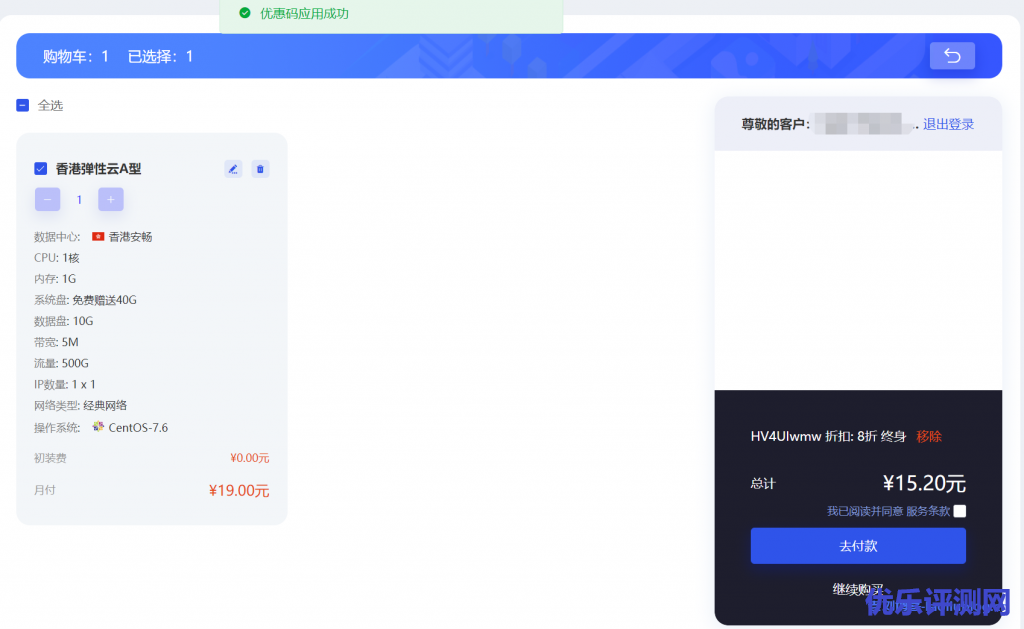 青云互联本次促销的中国香港弹性云服务器最低配置为:CPU:1核;内存:1G;系统盘:40GB SSD;数据盘:10GB SSD;宽带:5M;流量:500G;IP:1个;如图使用优惠码即可,实付15.2元/月。点此购买>>