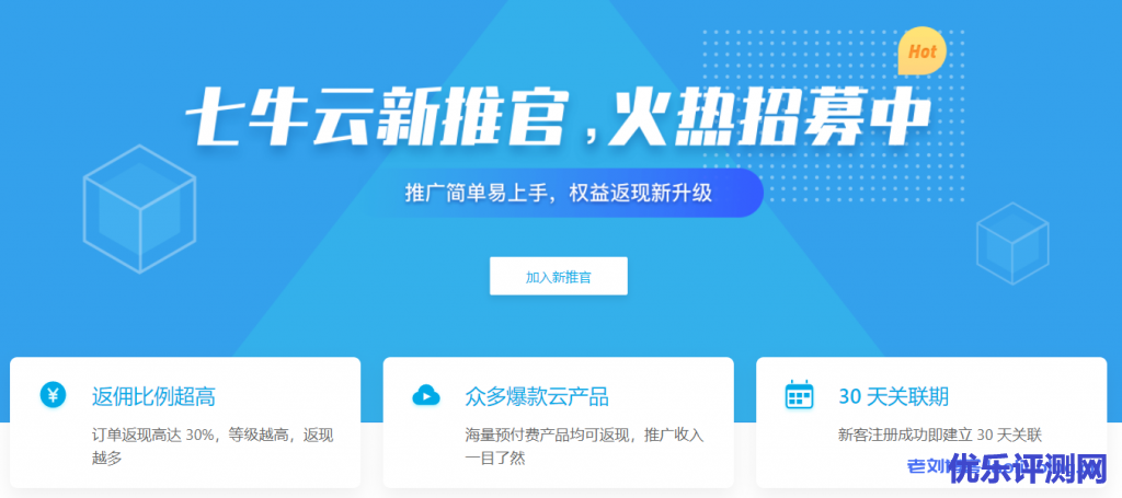如阿里云、腾讯云、华为云、金山云、UCloud,qiniu七牛云近期也推出了CPS推荐返利政策,并为推荐者取名“新推官”,七牛云CPS推广奖励最高返30%现金奖励。老刘博客这里详细介绍下qiniu七牛云新推官招募申请入口,推广奖励比例,推广流程,推广攻略及推荐奖励规则解释。