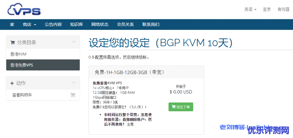 免费送香港VPS活动:0元,每天前5个,1G内存、1核、12G SSD、10G流量/月,购买链接
