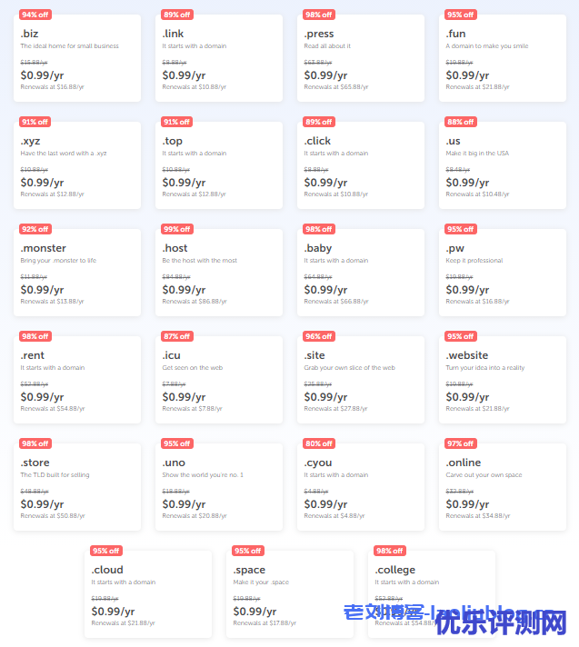 老刘博客昨天翻看邮件,看到Namecheap商家推送的优惠信息:有.biz/link/xyz等23种域名后缀注册可以享受低至0.99美元首年注册的价格,一来有些是可能老牌的国际域名。比如.BIZ,大部分是一些比较新奇的后缀。都是只需要0.99美元/首年,如果我们有需要的话可以看看,适合我们需要降低成本的站群和垃圾网站,包括我们有些时候也注册便宜域名测试项目。如果我们有需要注册的可以看看。
