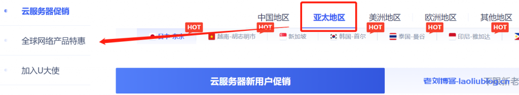 当UCloud全球大促云服务器促销模块选择非中国地区,如亚太地区、美洲地区等海外地区时,页面下会展示全球网络产品特惠专题促销: