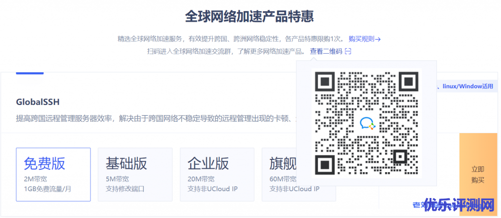 UCloud全球大促全球网络产品特惠专题下精选了全球网络加速服务,有效提升跨国、跨洲网络稳定性,各产品特惠限购1次。同时可以扫码进⼊全球网络加速交流群,了解更多网络加速产品。前往活动页>>