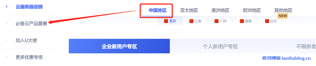 当UCloud全球大促云服务器促销模块选择中国地区时,活动页面会展示出必备云产品特惠专题。