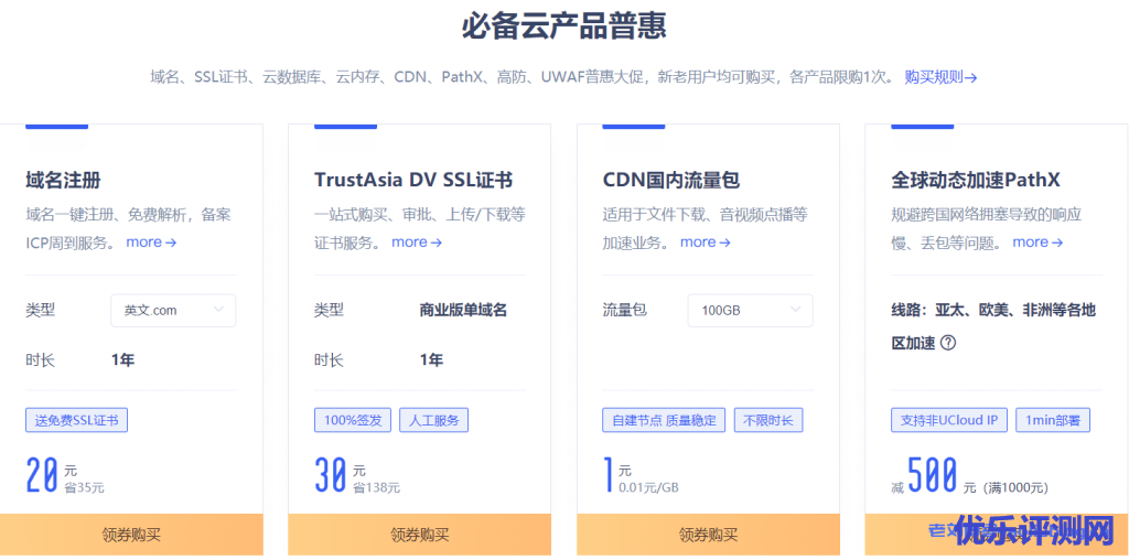 UCloud全球大促全球必备云产品特惠专题下域名、SSL证书、云数据库、云内存、CDN、PathX、高防、UWAF普惠大促,新老用户均可购买,各产品限购1次。值得一提的是.com域名注册首年仅20元,.cn域名注册首年仅10元,付费SSL证书仅30元一年,100G国内CDN流量包仅1元(不限时长使用)。前往活动页>>