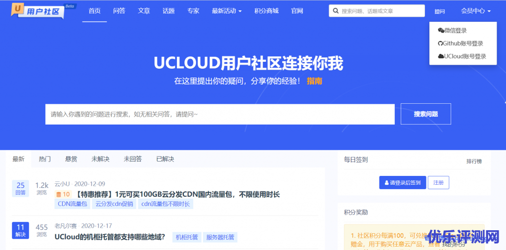 UCloud在去年底就悄悄推出了自家的社区站点:UCloud用户社区,只是没有大范围推广,这里UCloud在全球大促活动页贴出社区,如果用户对他们产品和全球大促有疑问的,可以直接在他们社区发帖询问。社区支持自行注册账号、微信、GitHub账号或UCloud官网账号登录,且设置了积分获取渠道,一定积分可以兑换UCloud账号赠金、产品代金券及周边礼品,老刘一个月内已经用积攒的社区积分兑换了差不多300元赠金,妥妥买了好几个域名~。立即前往