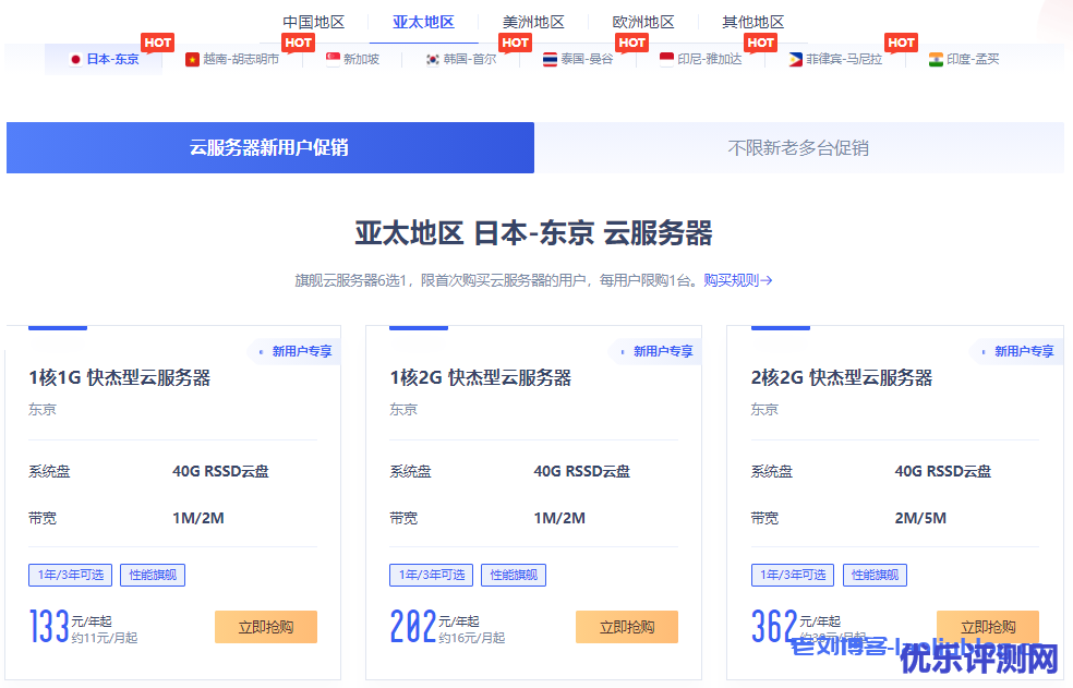 UCloud全球大促云服务器促销分新用户促销和新老用户促销,前者限购1台,后者限购10台。新用户区分个人和企业,当然配置相同可能价格企业更便宜些。老刘博客这里特别推荐企业新客户北上广机房4核8G内存5M带宽首年898元,个人新客户同此配置首年956元。促销的数据中心包括中国、亚太、美洲、欧洲和非洲地区,具体机房在北京、上海、广州、香港、台北、东京、胡志明市、新加坡、首尔、曼谷、雅加达、马尼拉、孟买、华盛顿、洛杉矶、圣保罗、莫斯科、法兰克福、伦敦、拉各斯(西非尼日利亚)和迪拜。前往活动页>>