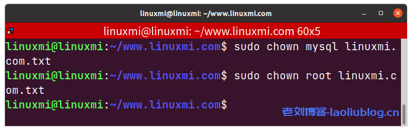 chown命令用于更改文件的所有权。假设有一个名为linuxmi.com.txt的文件,您是linuxmi。您想要将所有权转让给mysql。