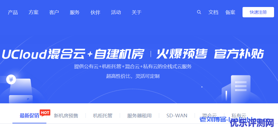 UCloud优刻得昨日上线了UCloud混合云+自建机房|火爆预售 官方补贴活动,UCloud可提供公有云+机柜托管+混合云+私有云的全栈式云服务,超高性价⽐,灵活可定制。活动包括最新促销、新机房预售、机柜托管、服务器租用、SD-WAN、混合云和私有云多个专题,本篇文章,老刘博客就活动页最新促销专题为大家介绍下。